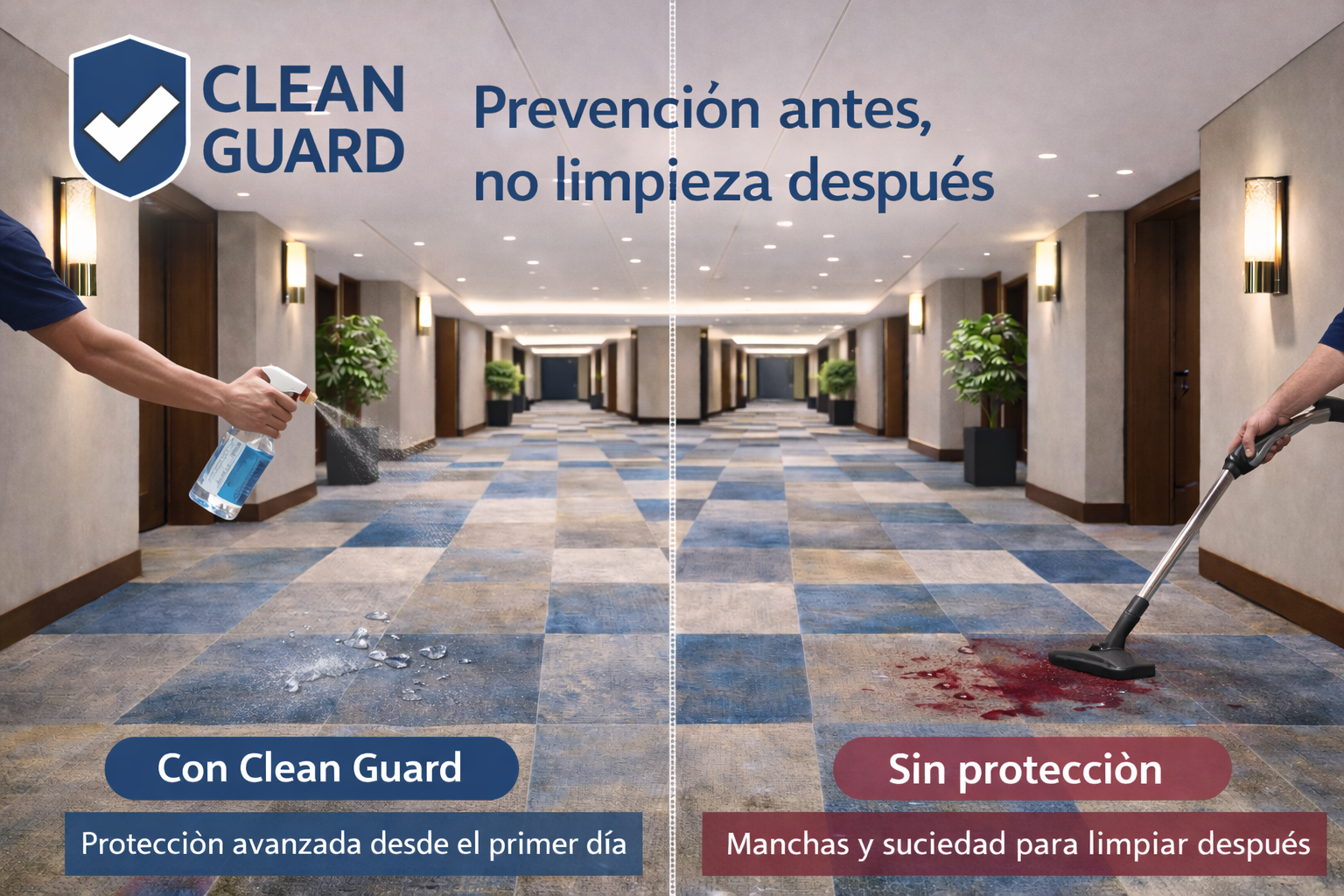 Mientras otras soluciones solo limpian después, Clean Guard previene el problema antes de que exista, protegiendo su moqueta desde el primer día.